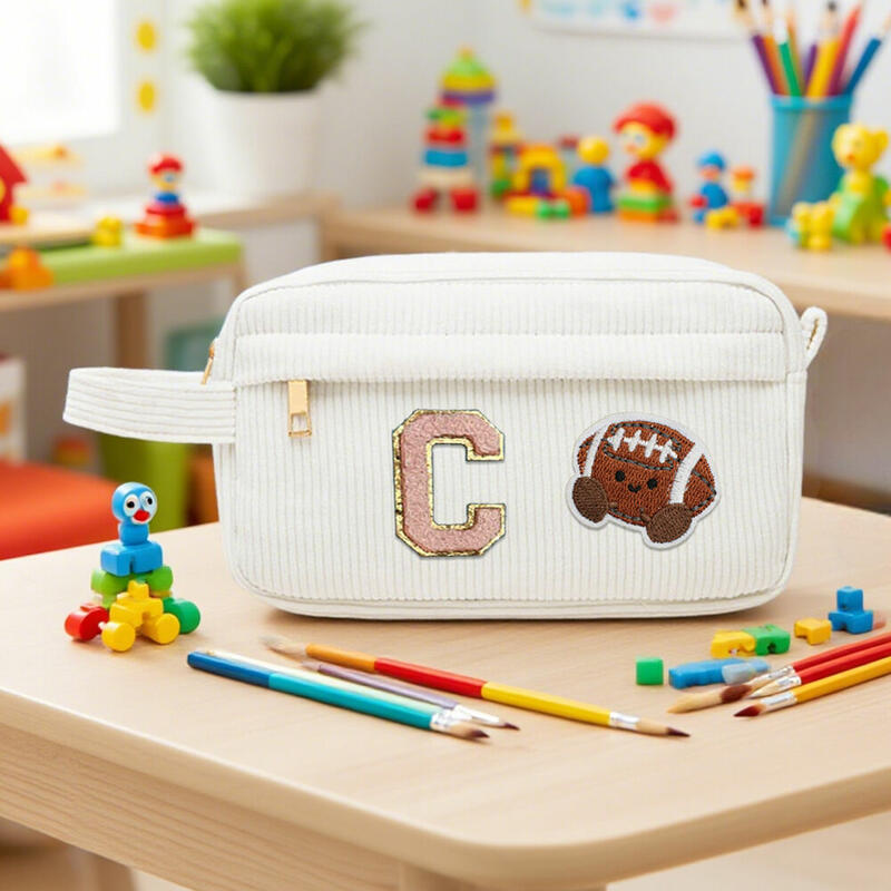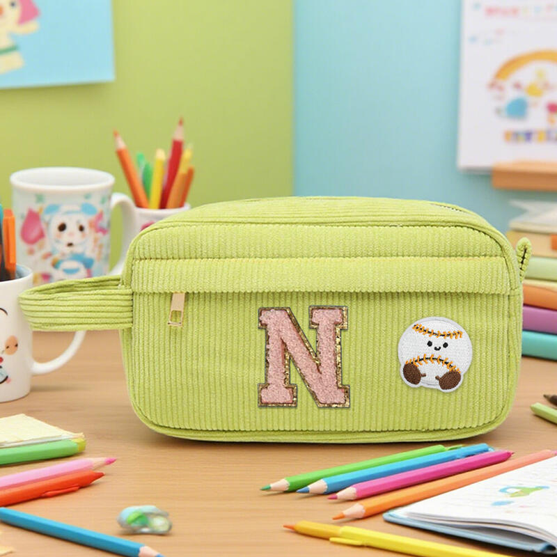 Personalized Corduroy Pencil Bag with Cartoon Ball Embroidery Patch Birthday Gift for Boys