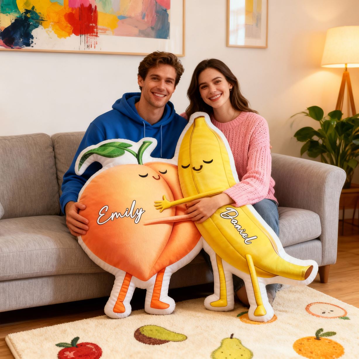 Personalized Fruit-Print Pillows Banana and Peach Pillows Couple Names Cushions for Valentine's Day