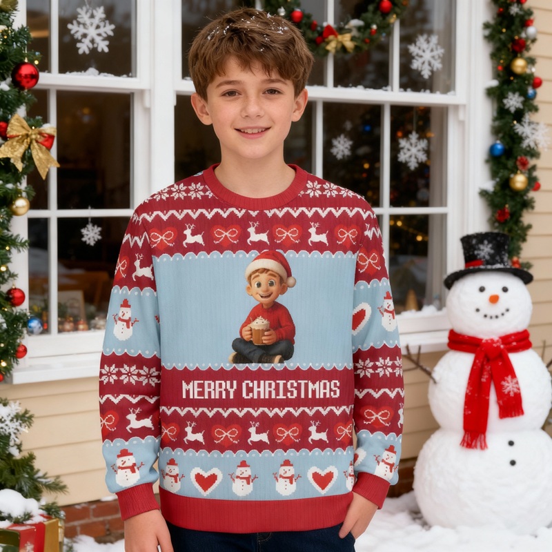 This sweater has a fun custom photo feature that makes it stand out. Pick your child's favorite snapshot (silly family selfies, pup-in-Santa shots, goofy friend photos, or a vivid moment of their own), and we’ll print it in vibrant, long-lasting color right on the sweater. Paired with various Christmas-related patterns, the sweater is filled with a festive vibe. It’s a wearable atmosphere activator, conversation starter and nostalgia trigger for all holiday gatherings.​