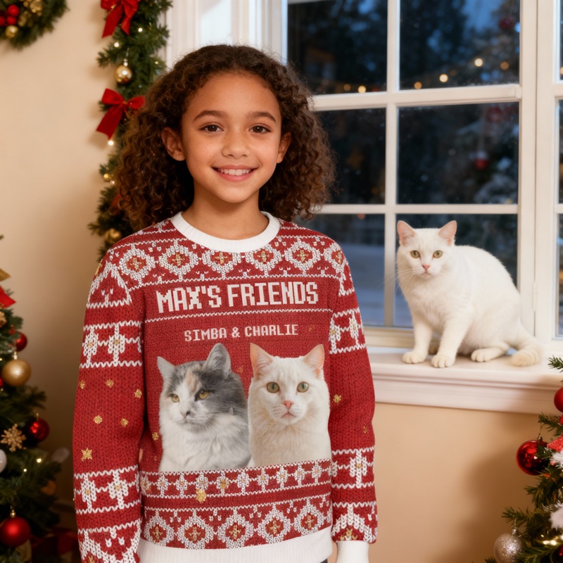 Personalized Kids Ugly Sweater Unisex Custom Photos Festive Red Design Christmas Gift for Pet Lovers