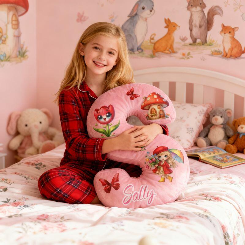Personalized Letter-Shaped Pillow Butterfly Mushroom House Red Style Design Gift for Girls