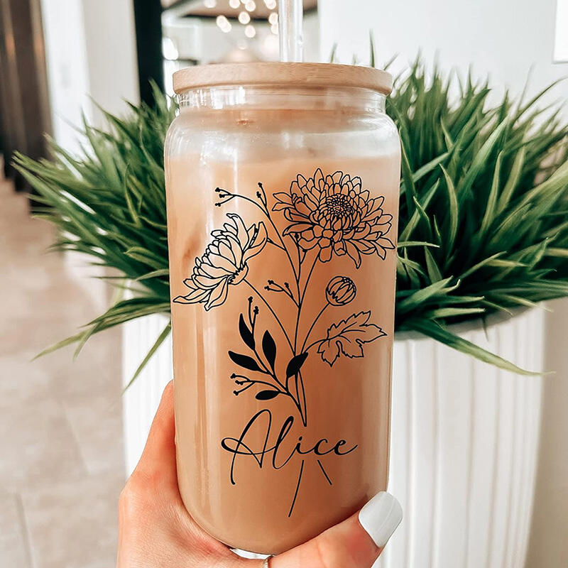 Personalized Name And Birth Flower Glass Cup with Lid And Straw Cool Gift for Kids