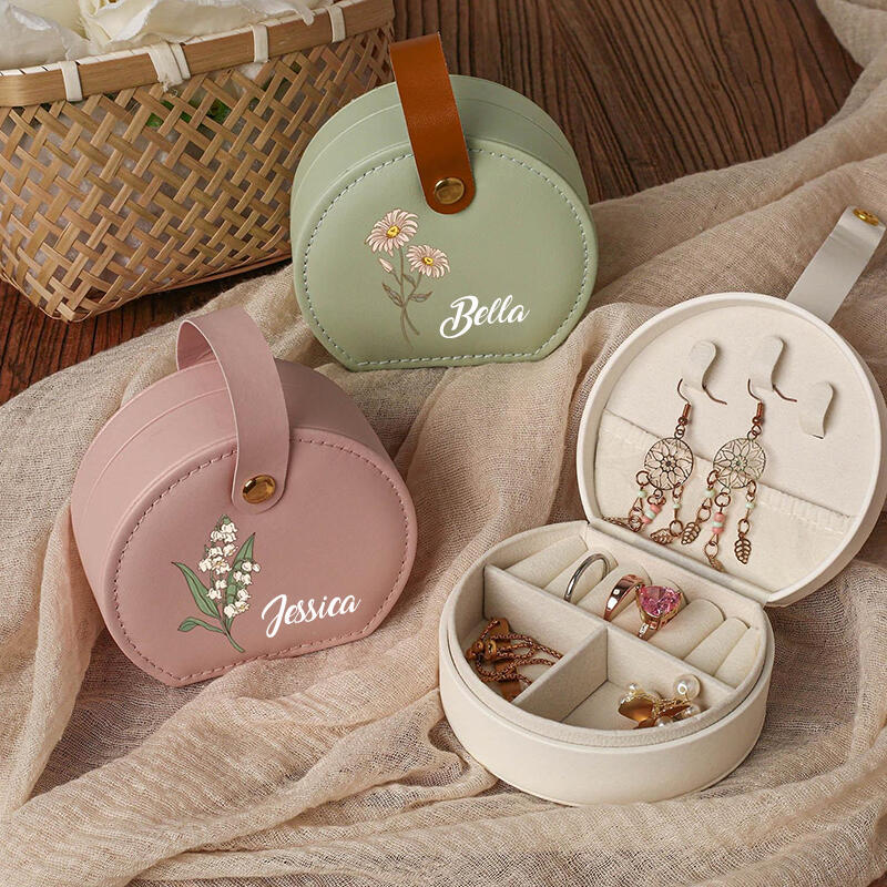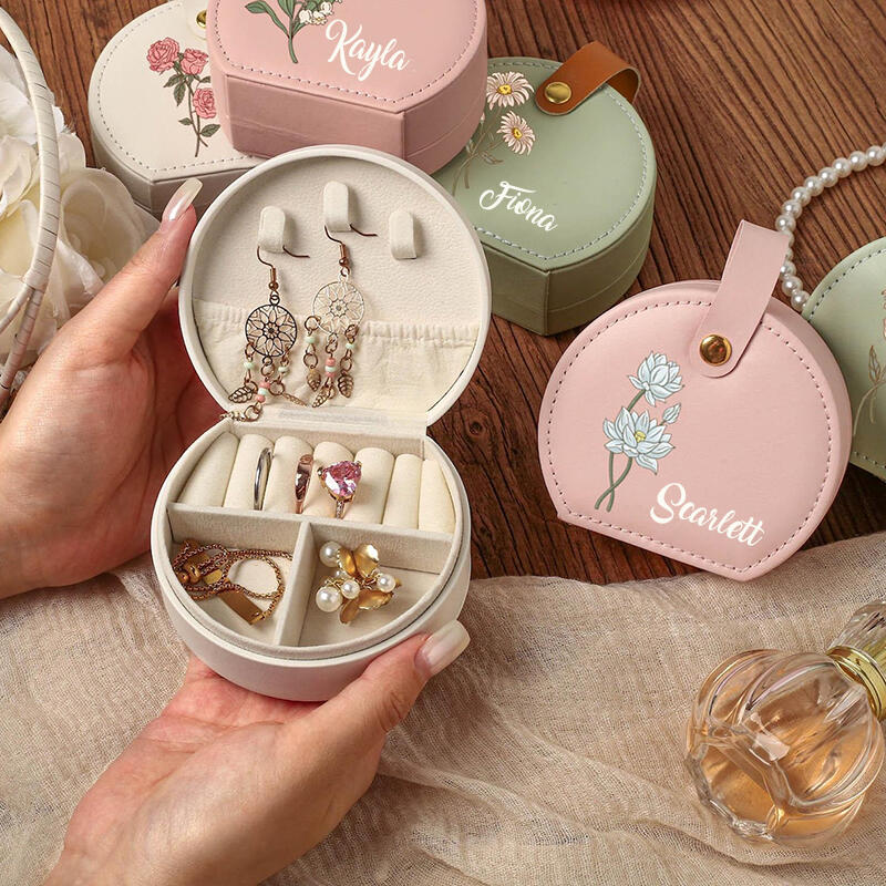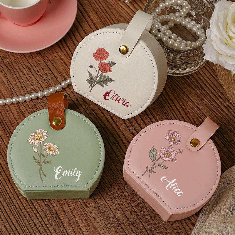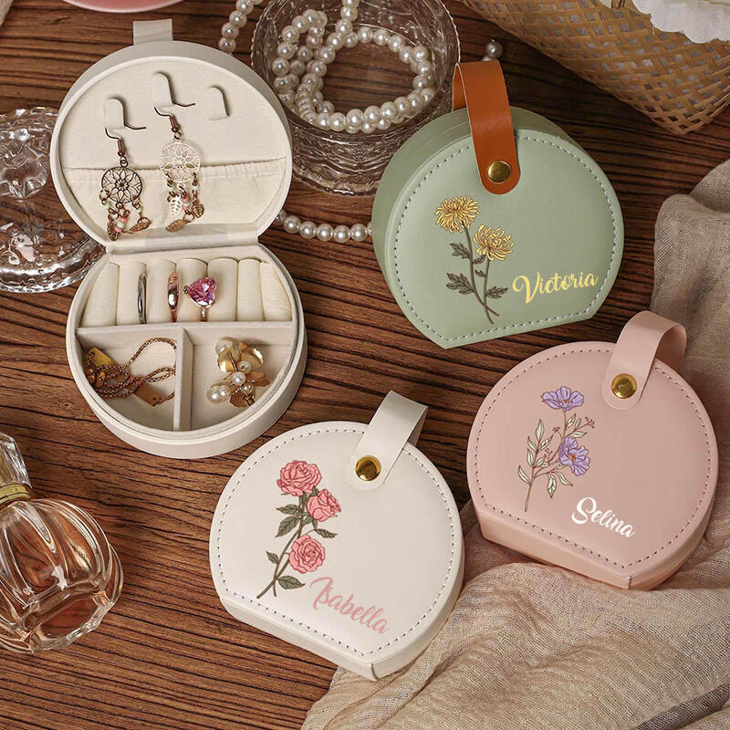 Personalized Name Travel Jewelry Case with Custom Birthflower Best Gift for Her