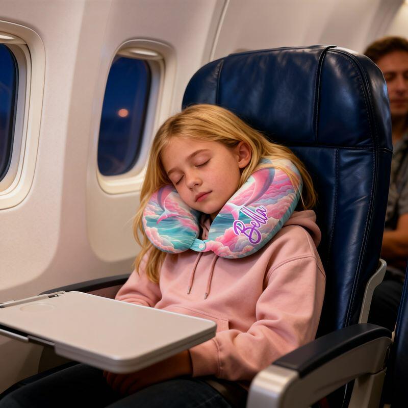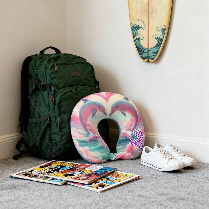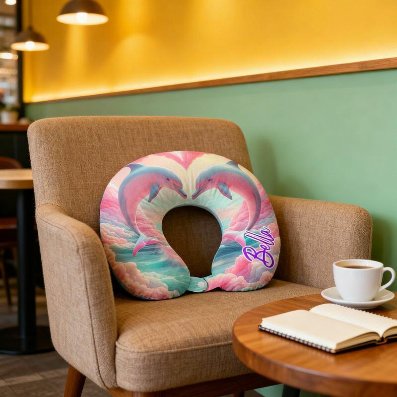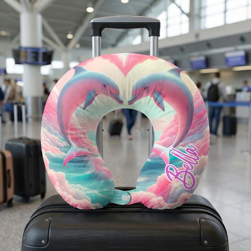 Personalized U-Shaped Neck Pillow Pink Cloud Sky Heart Dolphins Design Dreamy Gift for Her